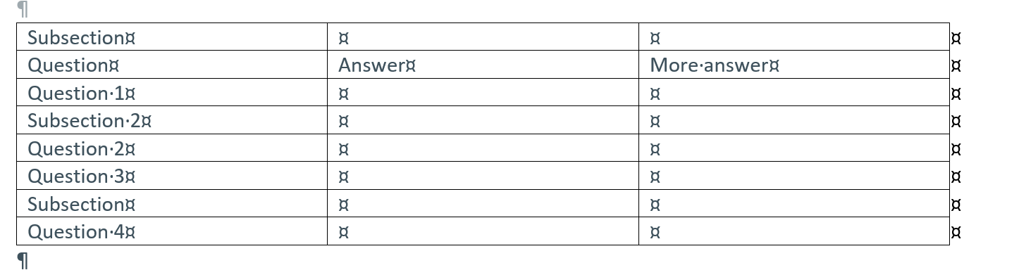 Unfortunately, when exporting to their template, the table breaks and each sub-section is outside of the table with a new table starting after it. I've run a test on my end to ensure it's not something that is built into their styles (checking both table and section styles). If I map a project with the following table: